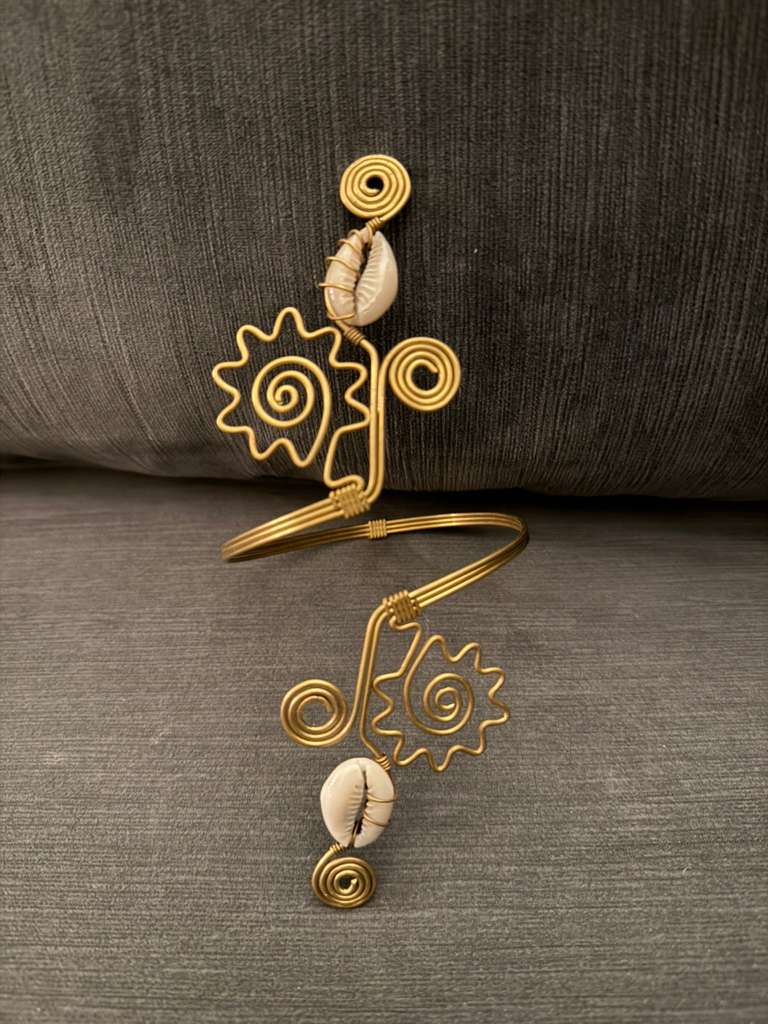 A striking statement of African elegance and craftsmanship, the ABOF Cowrie Sun Spiral Arm Cuff is handcrafted from radiant brass and shaped into an elegant sculptural design. Bold yet refined, this piece wraps the arm with strength and grace, reflecting the beauty and symbolism of traditional African adornment.