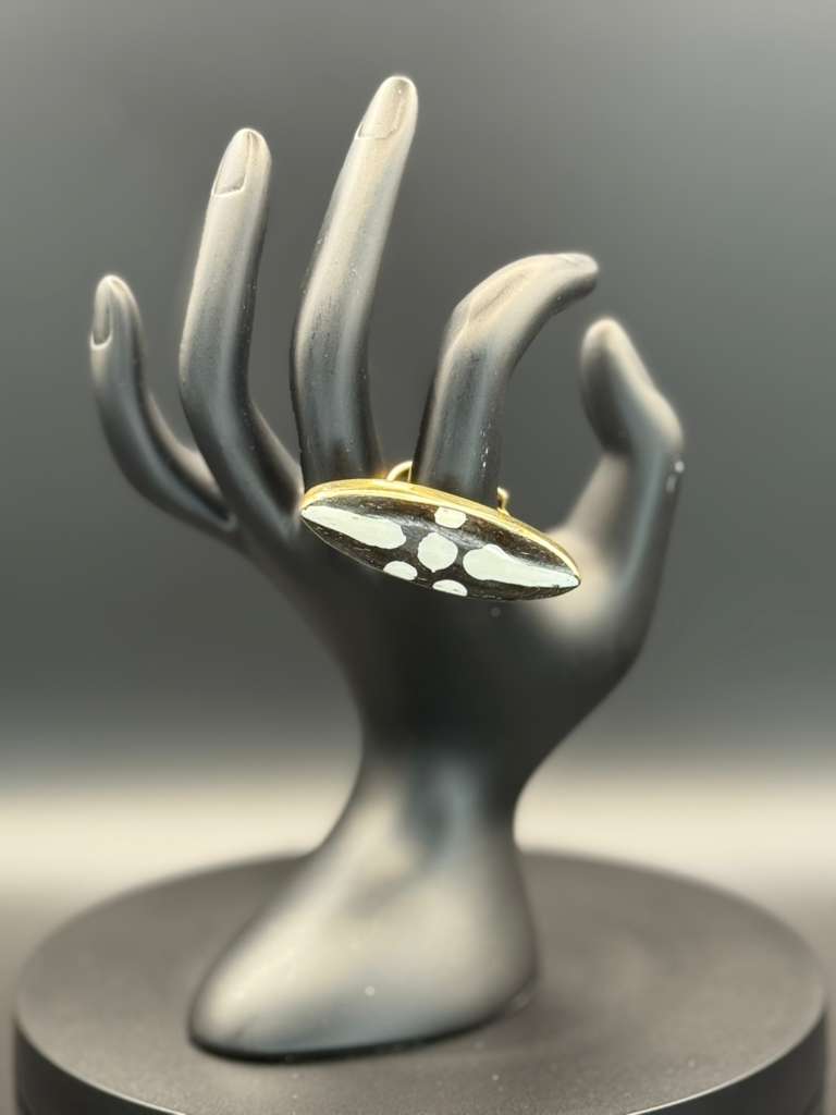 A sophisticated fusion of African heritage and modern elegance, the ABOF Pebble Dot B&B Ring is handcrafted from brass and natural bone, featuring a smooth oval face with scattered dot patterns reminiscent of natural stone textures. Its soft yet bold design adds subtle character to any look.