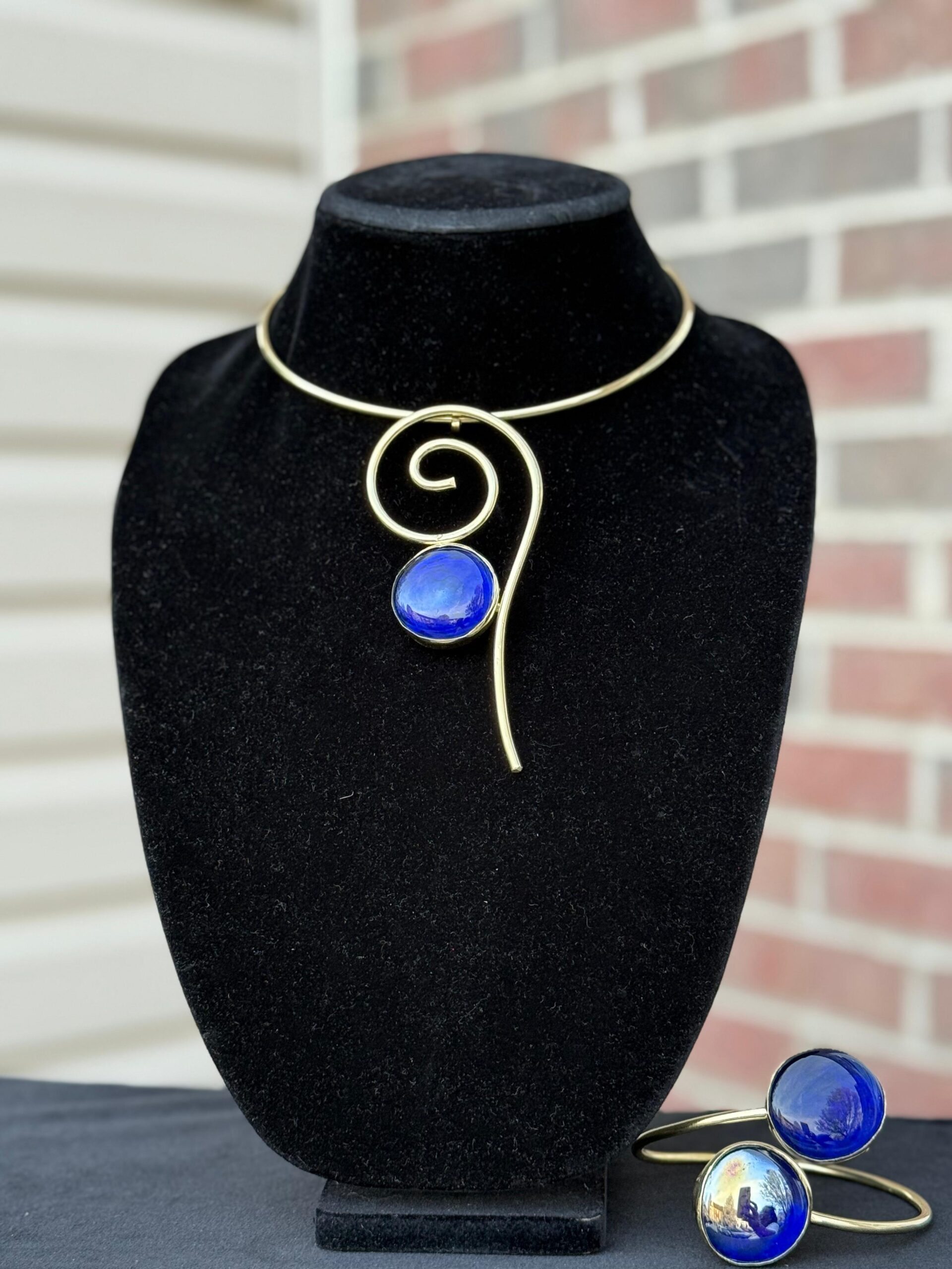 The choker sits powerfully along the neckline, while the matching arm cuff wraps gracefully around the arm, creating a harmonious balance of strength and elegance. Together, they form a striking set that commands attention while remaining refined and timeless.