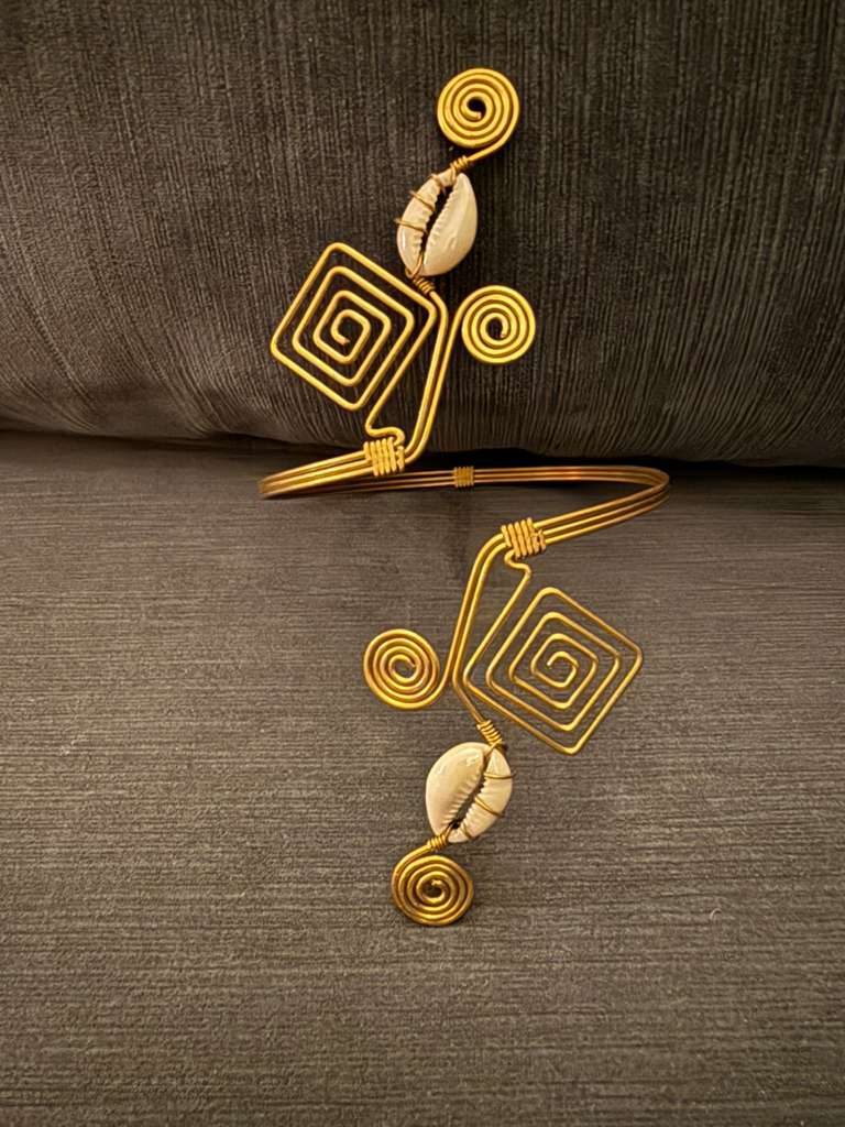 A striking statement of African elegance and craftsmanship, the ABOF Square Spiral Cowrie Arm Cuff is handcrafted from radiant brass and shaped into an elegant sculptural design. Bold yet refined, this piece wraps the arm with strength and grace, reflecting the beauty and symbolism of traditional African adornment.