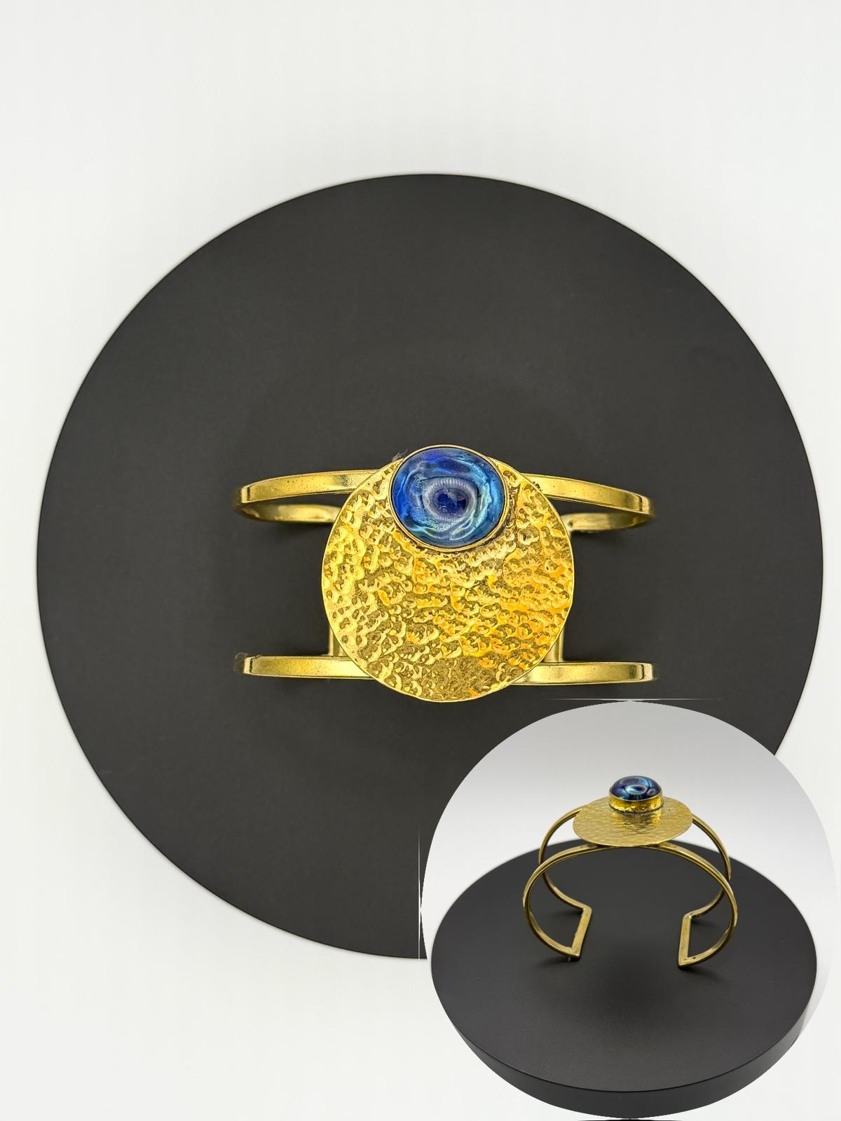 A striking blend of African heritage and modern elegance, the Abyss Vortex Solaris Double Bangle Bracelet is handcrafted from radiant brass and beautifully adorned with natural resin and luminous glass pearls. The double bangle design creates a bold yet graceful statement, reflecting the richness and artistry found in traditional African adornment.
