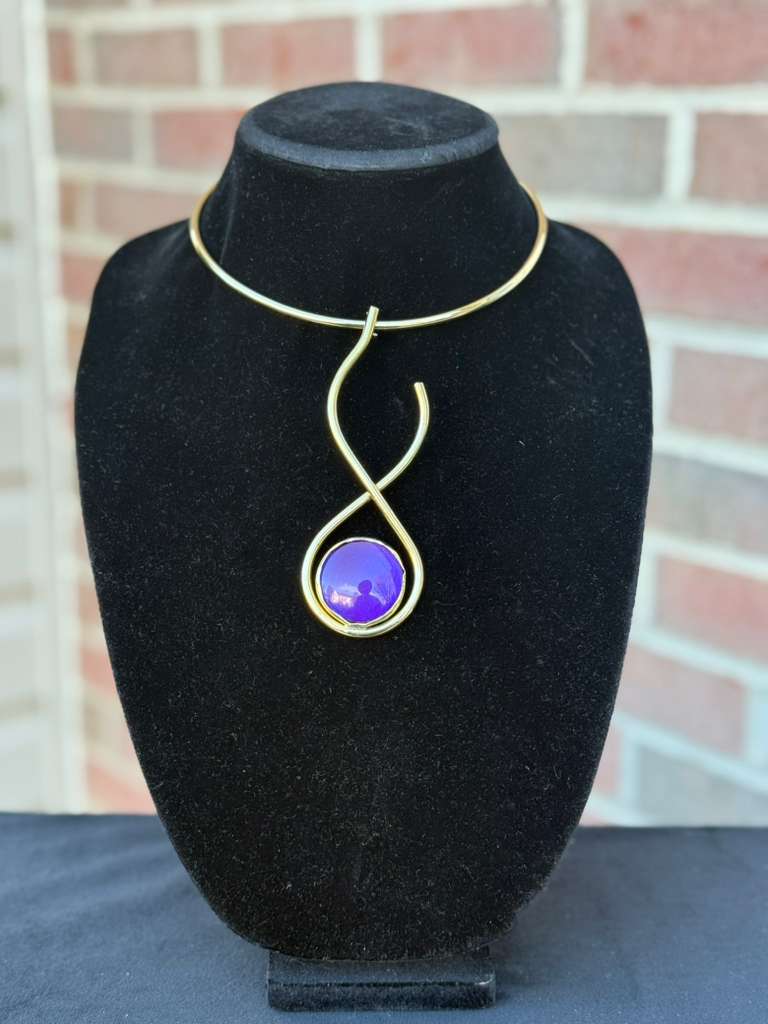 A bold Afro-chic choker necklace crafted from 100% brass and accented with a purple glass stone. The twisted silhouette adds movement and elegance, creating a modern yet artistic statement piece.