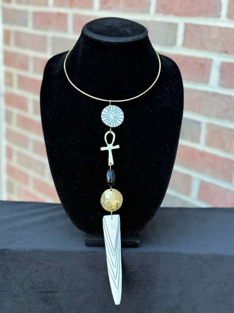A refined expression of African elegance and heritage, the Ankh Totem Single Drop Choker is handcrafted with a bold brass choker base, accented with engraved natural bone elements and horn details, along with a subtle bead accent. The single drop design features the iconic Ankh symbol, forming a totem-inspired vertical arrangement that creates graceful movement while maintaining a strong, symbolic silhouette rooted in traditional African adornment.
