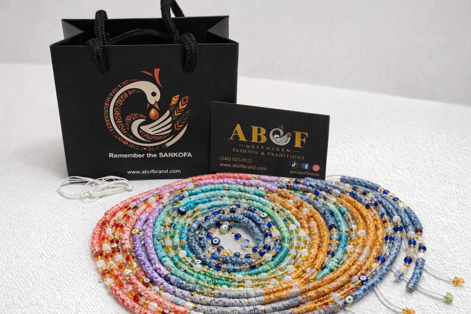Inspired by the legendary strength of Queen Mother Yaa Ashantewa, this waist bead design embodies protection, courage, and sacred feminine power. Crafted with clay beads, crystal accents, and a striking evil eye charm, this piece blends beauty with deep spiritual symbolism.