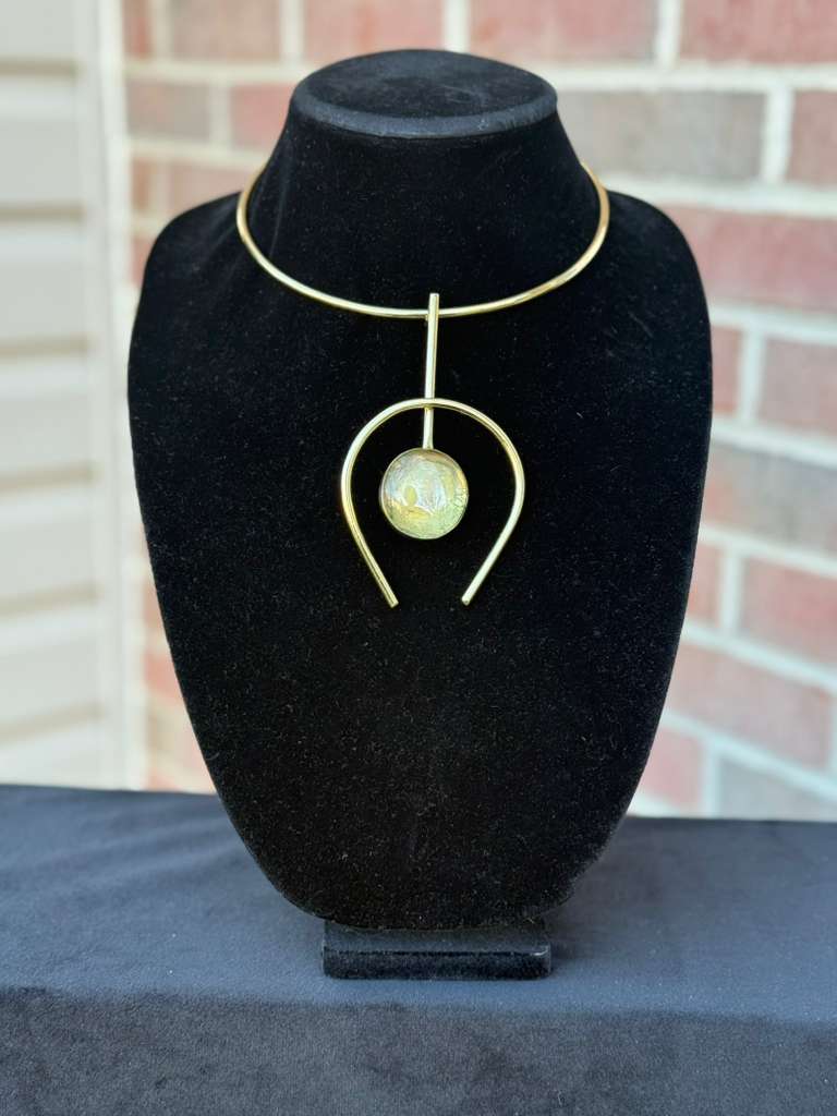 A bold Afro-chic choker necklace crafted from 100% brass and accented with a textured glass stone suspended within an arch-inspired design. This handcrafted piece highlights structure, balance, and timeless style.