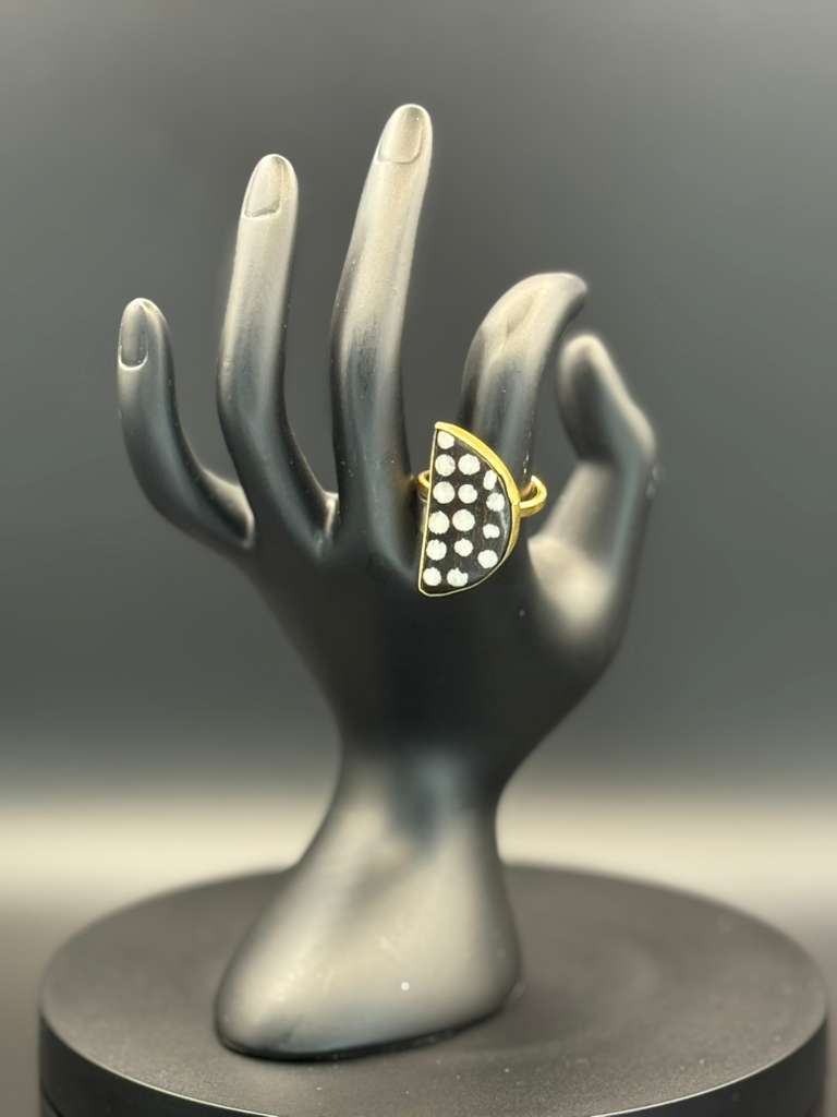 A sophisticated fusion of African heritage and modern elegance, the ABOF Half Moon Dot B&B Ring is handcrafted from brass and natural bone, featuring a half-moon silhouette adorned with bold dotted patterns. The contrast design evokes rhythm and balance, making it a striking yet refined statement piece.