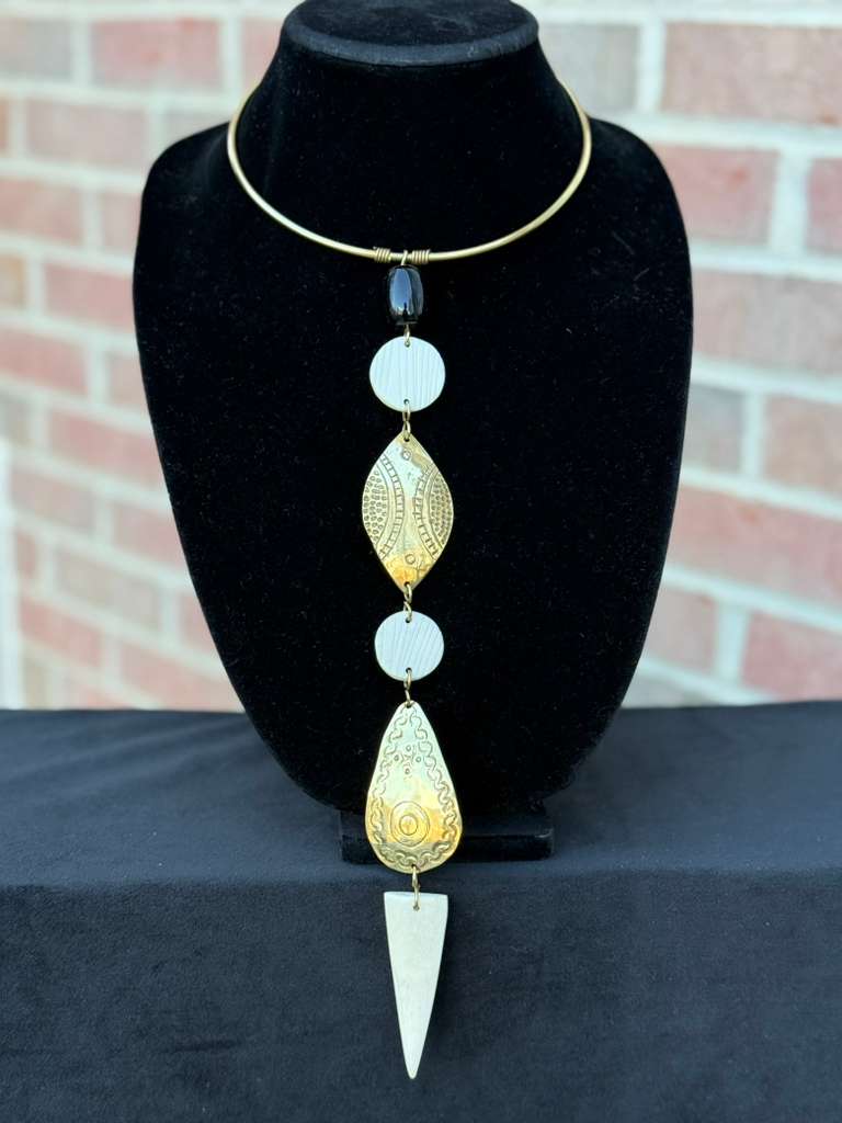 A refined expression of African elegance and heritage, the Ivory Totem Brass Single Drop Choker is handcrafted with a bold brass choker base, accented with engraved natural bone elements and horn details, along with a subtle bead accent. The elongated totem-inspired drop features layered geometric forms that create graceful movement while maintaining a strong, structured silhouette rooted in traditional African adornment.
