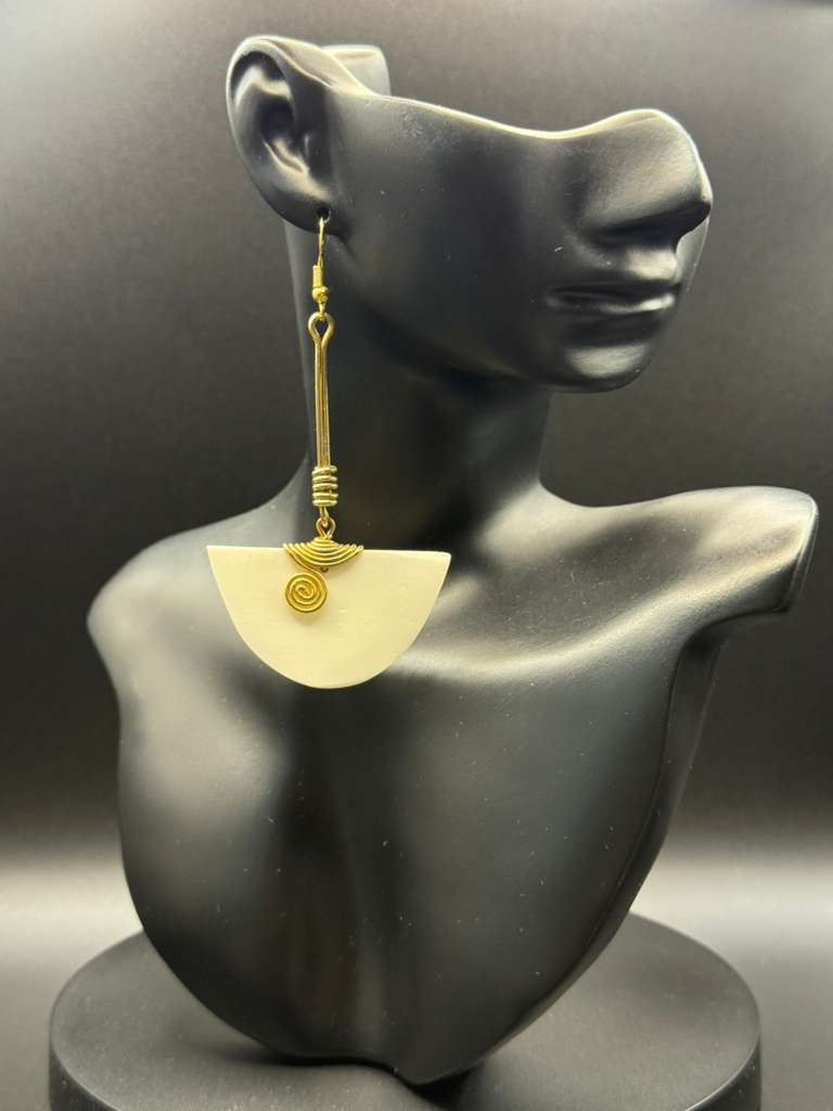 Handcrafted with brass, cowrie shells, horn, and natural bones, the Long Stem Half Moon Nefertiti Fan Earring reflects the bold Afro-chic identity of ABOF Brand. Each pair is unique, blending natural African materials with powerful design for women who love statement pieces rooted in culture.