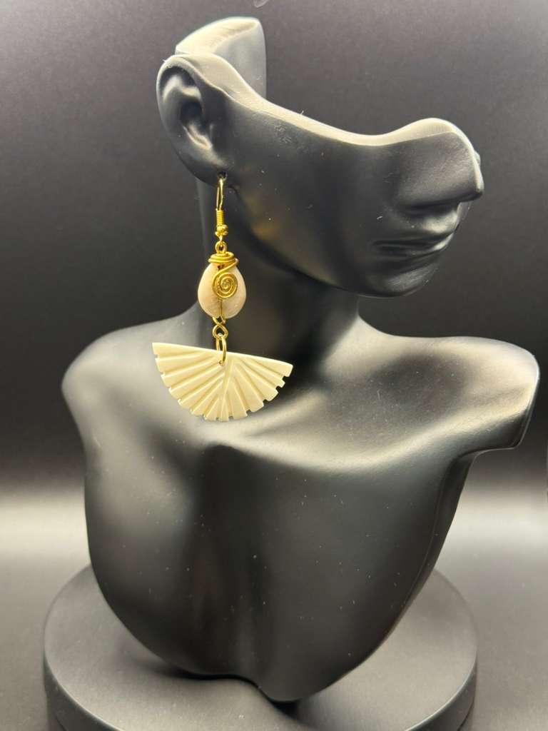 Handcrafted with brass, cowrie shells, horn, and natural bones, the Shel’Ries Coco – Spiral Cowrie Fan Earring reflects the bold Afro-chic identity of ABOF Brand. Each pair is unique, blending natural African materials with powerful design for women who love statement pieces rooted in culture.