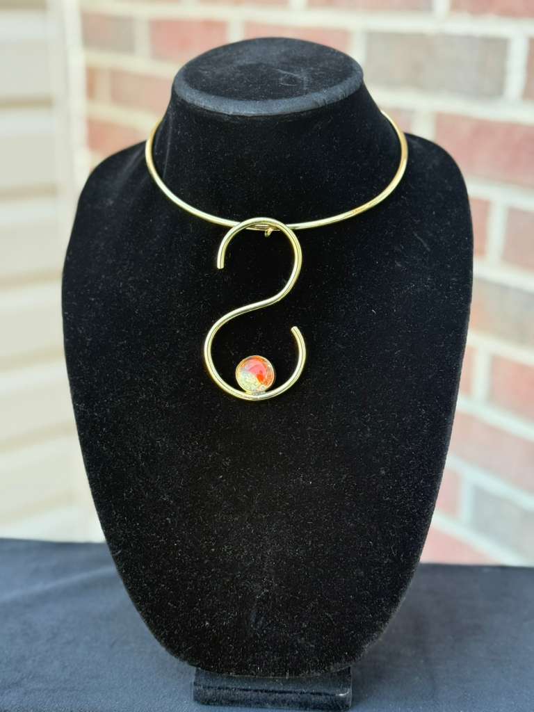 A bold Afro-chic choker necklace crafted from 100% brass and accented with a warm-toned glass stone. The spiral silhouette symbolizes energy and fluid motion, creating a timeless and eye-catching statement piece.
